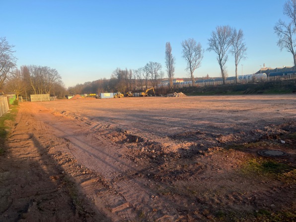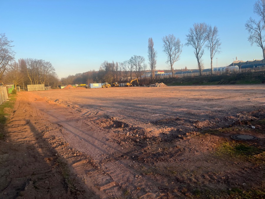 Die Arbeiten haben mittlerweile begonnen. Die Asche wurde bereits abgeräumt, vom ehemaligen Platz ist nicht mehr viel zu sehen. Seit einigen tagen ruhen nun allerdings die Bauarbeiten, Grund sind Luftbildauswertungen und die nötige Sondierung nach möglichen Blindgängern.