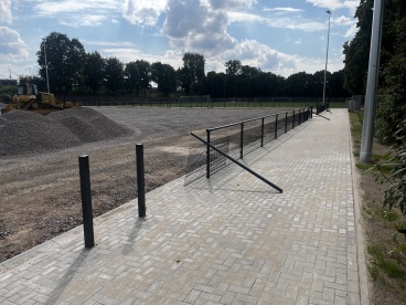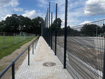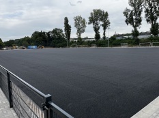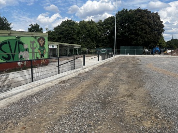 Langsam, aber sicher nimmt der Platz Form an. Die Strukturen sind schon gut zu erkennen. Die Pflasterung um den Platz ist fast abgeschlossen und die ersten Banden sind bereits montiert. Die neuen Flutlichtmasten stehen und die Flutlicht sind montiert.